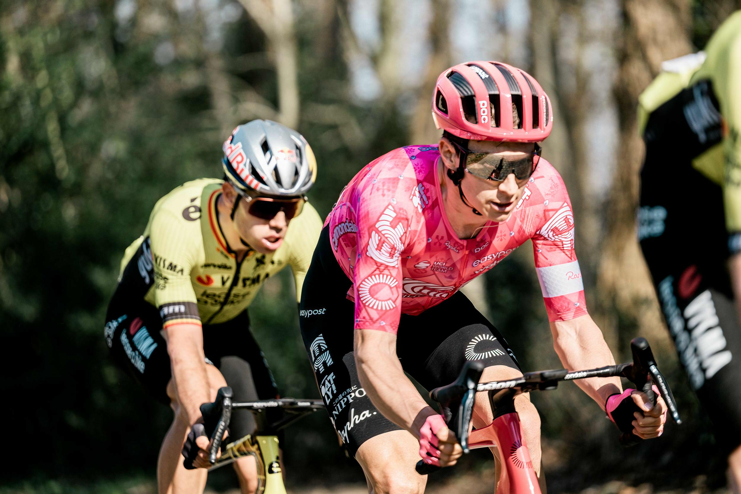 American rider Neilson Powless has won his first spring classic after a thrilling sprint against Wout van Aert. After riding at the front for 54 kilometres alongside three Team Visma | Lease a Bike riders, he kept his cool in the finale and finished it off in Waregem. He succeeds Matteo Jorgenson as the winner of Dwars door Vlaanderen.